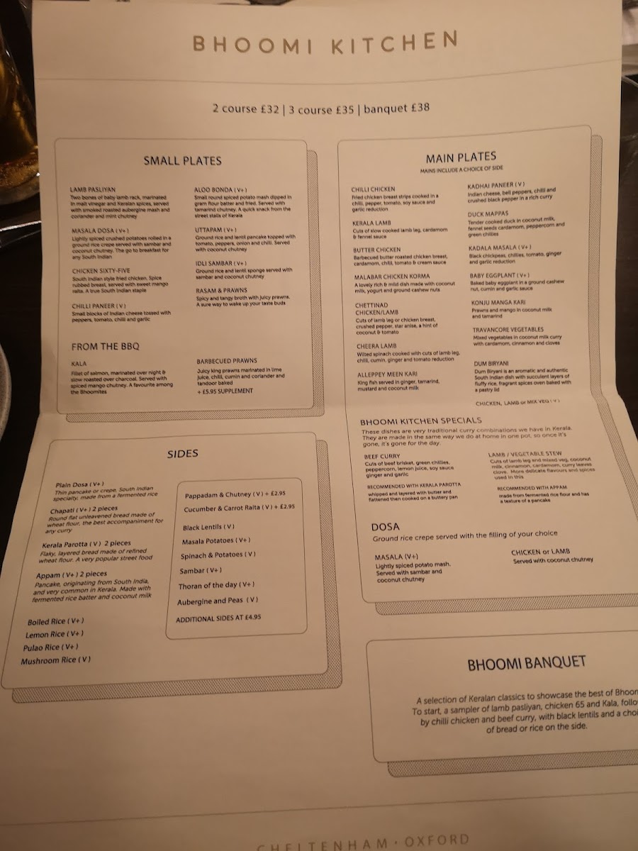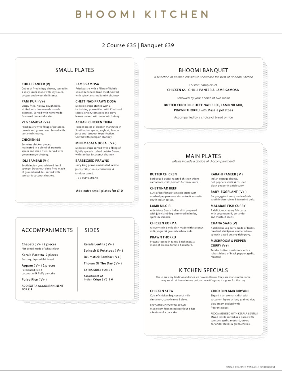 Followed by your choice of two mains: Butter Chicken Chettinad Beef Curry Lamb Nilgiri Prawn Thokku Served with Masala Potatoes and accompanied by a choice of bread or rice.