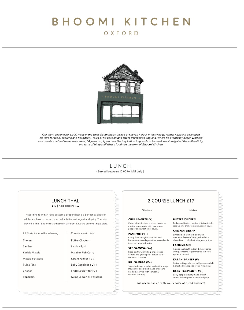 Discover a beautifully balanced Thali, inspired by Indian culinary traditions that bring together all six essential flavors—sweet, sour, salty, bitter, astringent, and spicy—on a single plate. Each Thali includes a selection of flavourful dishes: Thoran – A lightly spiced, vegetable stir-fry ( MU) Sambar – A hearty South Indian lentil stew (MU) Kadala Masala – A rich and aromatic chickpea curry (MU) Masala Potatoes – Spiced, golden potatoes ( G MU) Pulao Rice – Fragrant, seasoned rice Chapati – Soft, whole-wheat flatbread (G) Papadam – Crisp lentil wafers (SD, MI MU) Choose a main dish to complete your meal: Butter Chicken – A creamy, mildly spiced classic (SD, MI N) Lamb Nilgiri – A fragrant lamb curry with a hint of mint Malabar Fish Curry – A bold, tangy coastal delicacy (F) Kadai Paneer – Spiced paneer with bell peppers (V, MI) Baby Eggplant – A rich, slow-cooked dish (V+, N) Enhance your meal with a traditional Indian dessert (+£2): Gulab Jamun or Payasam – S